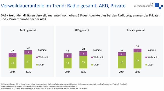 O Audio Trends, promovido anualmente pelas Landesmedienanstalten, é considerado um dos principais indicadores independentes sobre a evolução do rádio digital na Alemanha. A edição de 2025 foi baseada em dados da ma Audio (análise especial), permitindo comparações consistentes com os levantamentos anteriores. Em 2024, pela primeira vez, os dados foram extraídos a partir das medições de audiência da agma (Arbeitsgemeinschaft Media-Analyse), reconhecidas pelo mercado.